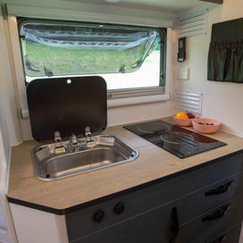 Unique pivot back-to-body kitchen housed under electric awning.